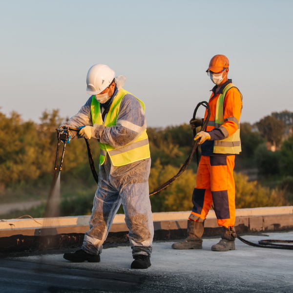 Нанесение проводится 2-канальной установкой: одновременно с эмульсией также напыляется катализатор, хлористый кальций. В результате резина распадается на воду и сухой остаток. Именно этот остаток и образует защитную мембрану на поверхности, а вода просто "выталкивается". Такой способ нанесения подходит даже для труднодоступных мест и для участков со сложным рельефом. В ответственных местах (в углах, в швах, на стыках) можно сделать больший слой. Поскольку технология нанесения безогневая, вся она пожаробезопасна.
