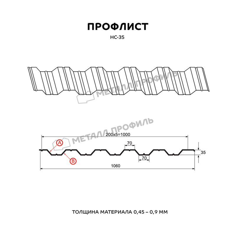 Профлист изготовлен из металла толщиной 0.7 мм, что обеспечивает ему прочность и долговечность. Он имеет форму НС-35, которая обеспечивает устойчивость к нагрузкам и ветровым нагрузкам.